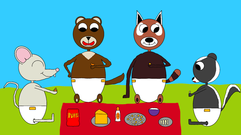 Oliver the mouse invited Ling Ling, Elise and Fletcher to a picnic one day, the catch: It featured nothing but cheesy things since mice love cheese. Ling Ling and Elise dug in with Oliver at the cheesy snacks, Fletch picked up a cheese stick and eminently gotten curious about its stick like shape. This was quite a delicious day they all had.