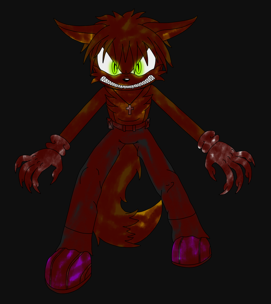 Need I say much? He's a vampire wolf covered in blood, highly unstable in a murderous feat, animalistic, and the only thing keeping a sliver of sense in him is that small cross around his neck... Never remove it... >_>; Lest he goes berzerk... As mentioned in his other pic, his skin is rock solid. And seeing him in this stance in front of you... *oh shit* *books it* RUN FOR THE HILLS!!! Because he's not shackled! D8