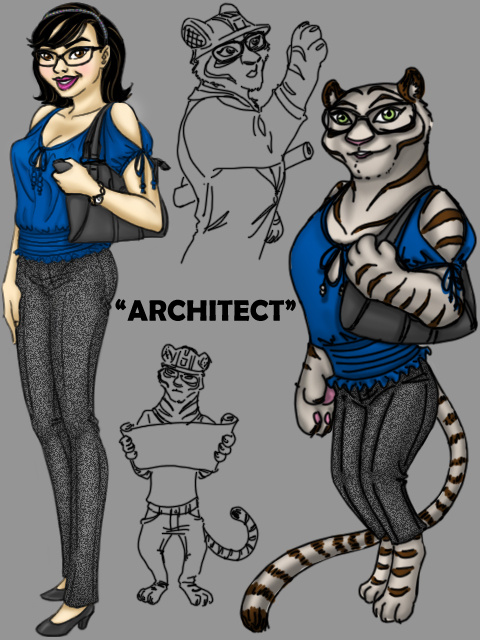 sleek but solid white tiger. Tall. White fur with black markings. Green eyes. Retired freelance model (print ads, TV commercials, ramp, etc).