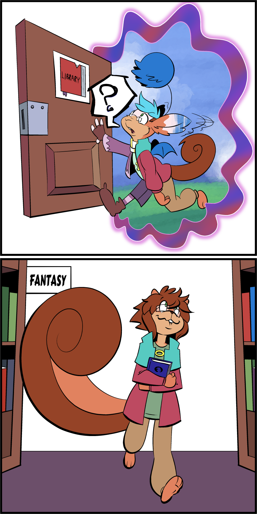! This time, he found a portal leading into a mysterious library. As he stepped through, his mind got fuzzy and started to shift with his body. Soon, he recalled he came to find a new fantasy book to read!