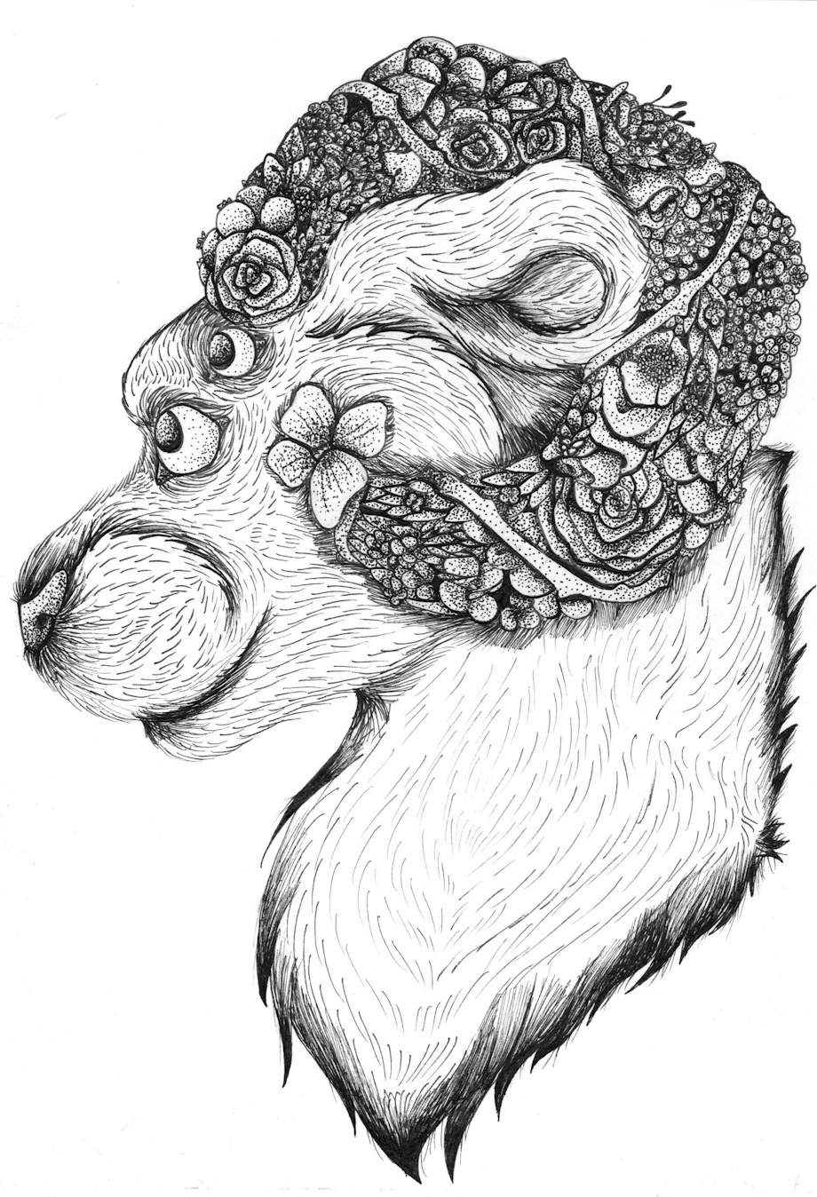 Outstanding drawing! Points on the flowers are so precise and very pretty. I love your careful fur lines, helps show off the forms of her head. Love it all!