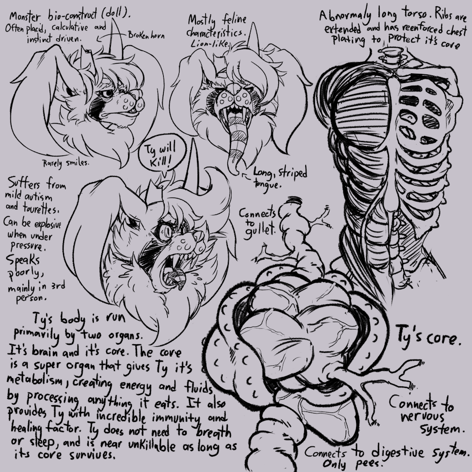 Ty is very calm and composed, though it can be unpredictable and even explosive. The monster suffers from depression swings, Tourette syndrome, and a speech impediment which makes it difficult to interact with at times. It is also very instinct driven, forgoing morals to satisfy its urges first and foremost, but not doing so recklessly.