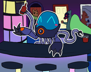 ROBOT: Welcome ladies, gentlemen, time worms, and people of all sorts to The World Without everyone’s favourite inter dimensional bar and grill. My name is Curiosity, but all my friends call me Curio and I’ll be your host for tonight!