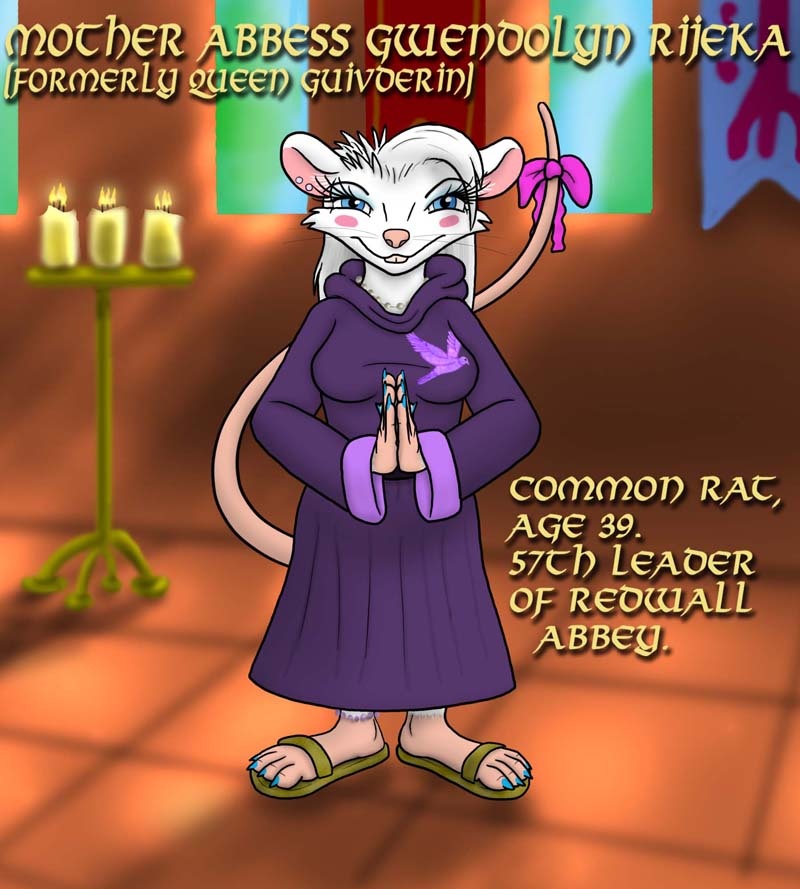 On December 25, 5647, a 27-year-old female rat, the former Queen Guivderin of Dugroznik, became Abbess Gwendolyn of Redwall Abbey. She was the first rat to ever hold the position. (The Dugrozi name 'Guivderin' cannot be spelled phonetically with the Mossflorian alphabet, so 'Gwendolyn' was chosen as the closest thing.)