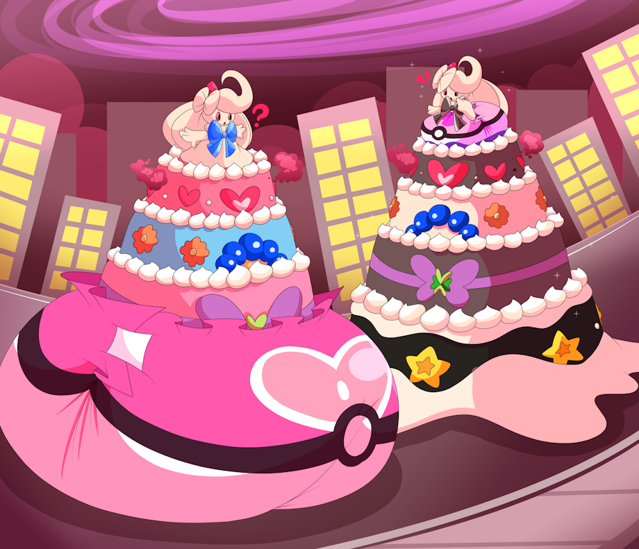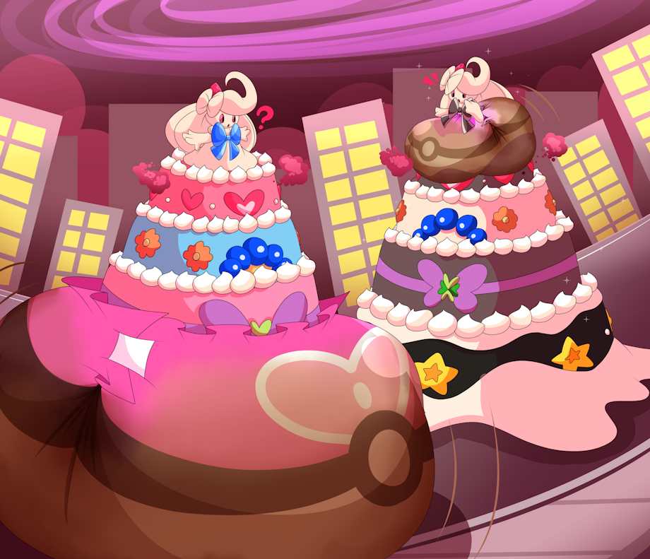I've seen two different ways to pad Gigantamax Alcremie, so I thought it would be funny to have two alcremies, each one diapered a different way and looking at the other like "Why's she wearing it *there*?" XD
