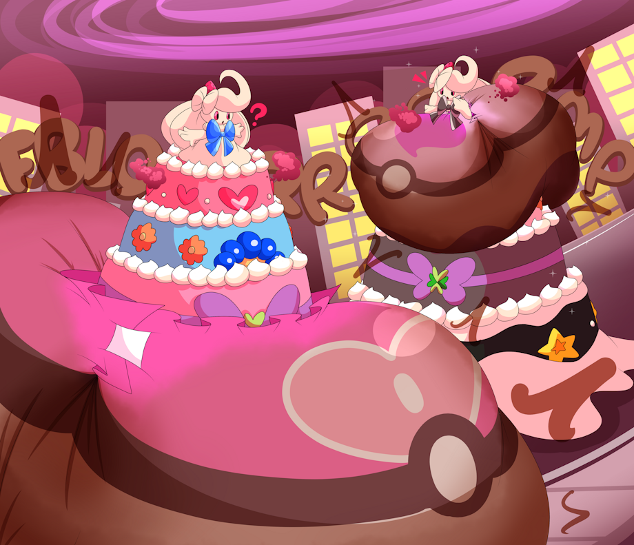 I've seen two different ways to pad Gigantamax Alcremie, so I thought it would be funny to have two alcremies, each one diapered a different way and looking at the other like "Why's she wearing it *there*?" XD