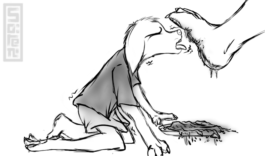 With a wide grin Jackson watched Limon do his work. Over time he had reared the wimpy fox quite according to his taste and meanwhile he licked his paws with passion and devotion. Not a single time he dared to complain, while he scraped the trampled meal off of his rank paws with untiring and powerful licks. This was the kind of respect and submission that Jackson truly deserved from such miserable, dumb fox!