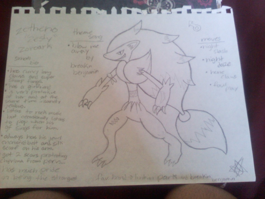 has curvier claws then other zoroarks also bares 2 scars one on his leg and one on his arm from protecting his girlfriend from a couple of rapists