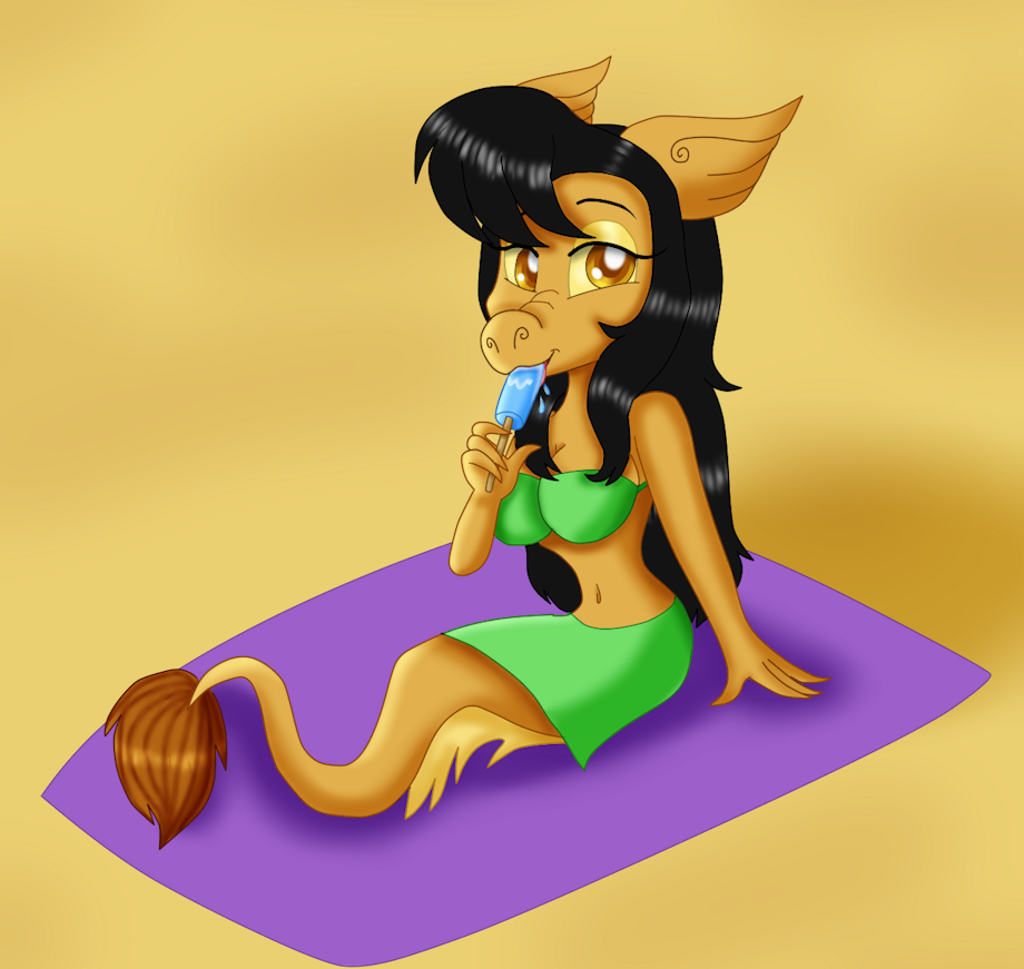 Here's a new pic of Leilani the dragoness. She's at the beach enjoying a yummy popsicle.