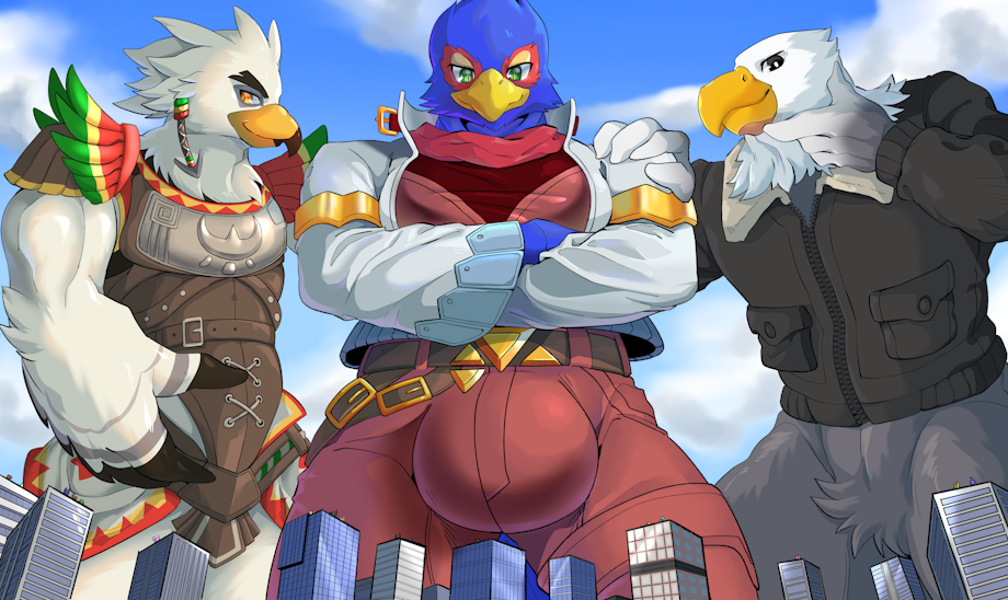 I requested macro Falco, macro Teba and macro Apollo looming over a city.