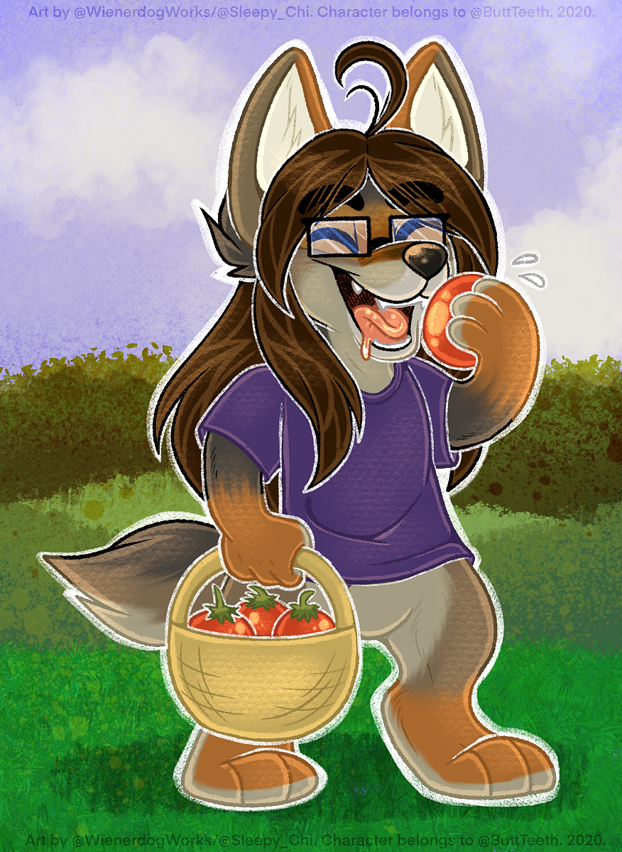 Featuring their coywolf (coyote/Mexican wolf) fursona eating a bunch of fresh tomatoes! <3