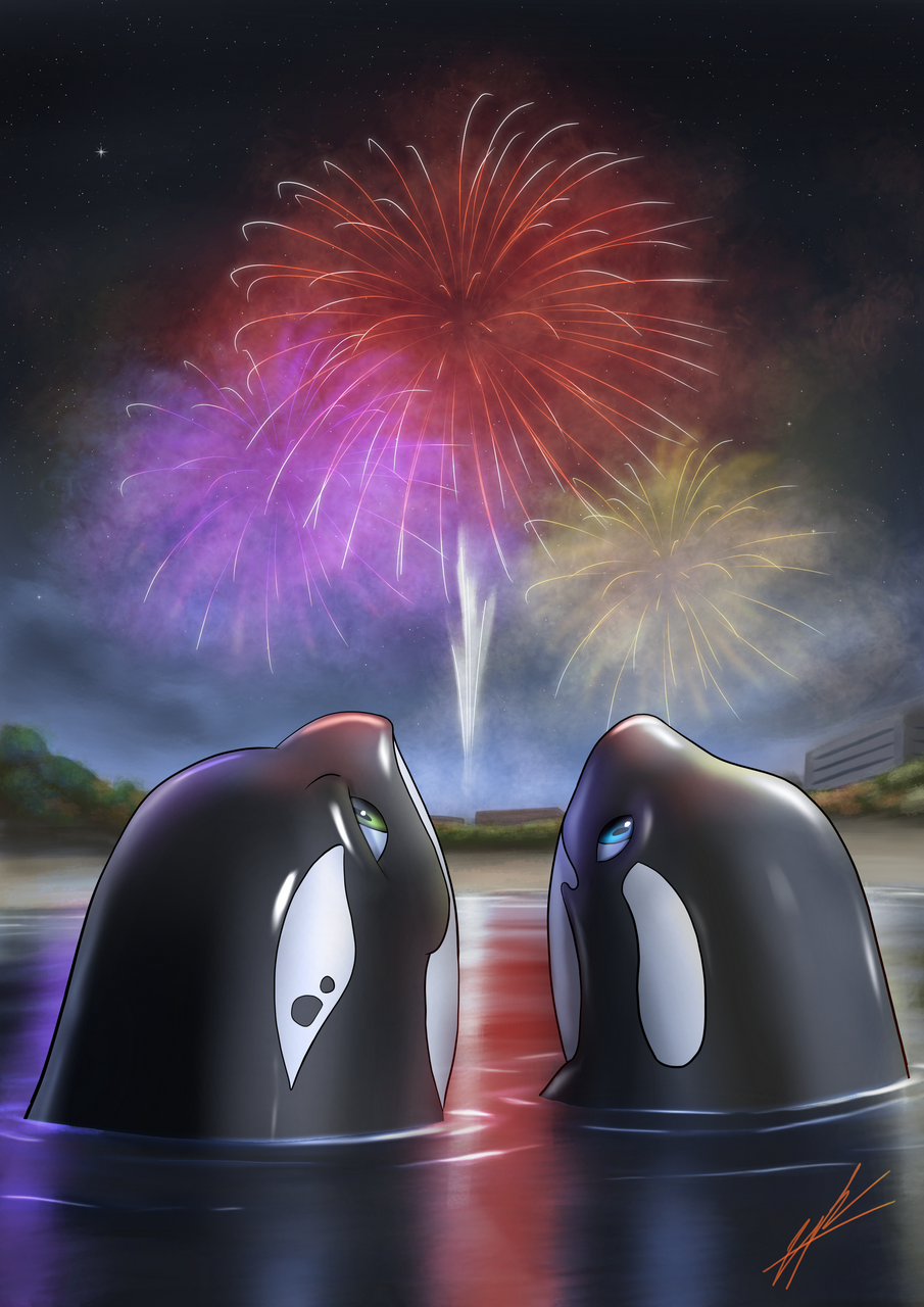 A commission I did for Windchill_Storm as a gift for TheoTheFox. Featuring the characters of TheoTheFox and Sirkus-Pandemounium enjoying some fireworks.