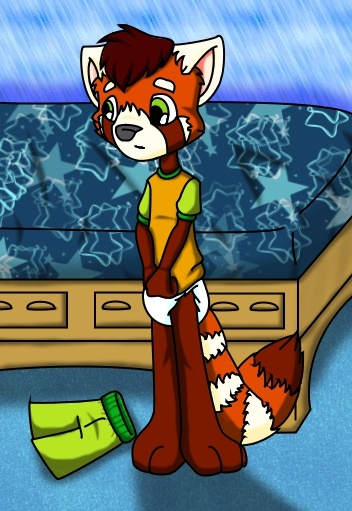 Akio walked into his room stretching having just finished watching a Marathon on TV. He was the only one still up. Or so he thought anyway. Despite being a cub again thanks to that incident with mismarked FOY Akio still had a taste for sci fi and when there's a Marathon of the stuff on TV. Even if your now no more than 8 physically you'll do your darndeds to stay up and watch it. Akio still wasn't quite used to being a cub again. Worst part of it were the gaps in his knowledge. Not memory. He could remember his first childhood fine but knowledge was sometimes lacking until he got his memory jogged by essentially relearning it. This ranged from things like his Multiplication tables to simple things like shoe laces on boots. Akio's toileting skills took a hit in the regression. Despite his potty training knowledge remaining Akio found that even once his regression stopped his potty skills seemed to get worse. He'd had several accidents before being put into trainers during the day and then after a few leaks and messes it was back to diapers for the lil Red Panda. Akio was less than pleased to need diaper changes again. Thankfully he did learn how to change his own wet diapers. He still needed help with messy ones though. Tonight his skills came in handy as he changed out of his soggy diaper from the Marathon. Just as he finished taping on the fresh diaper he heard a noie and turned to see an Albino Bat at his door.