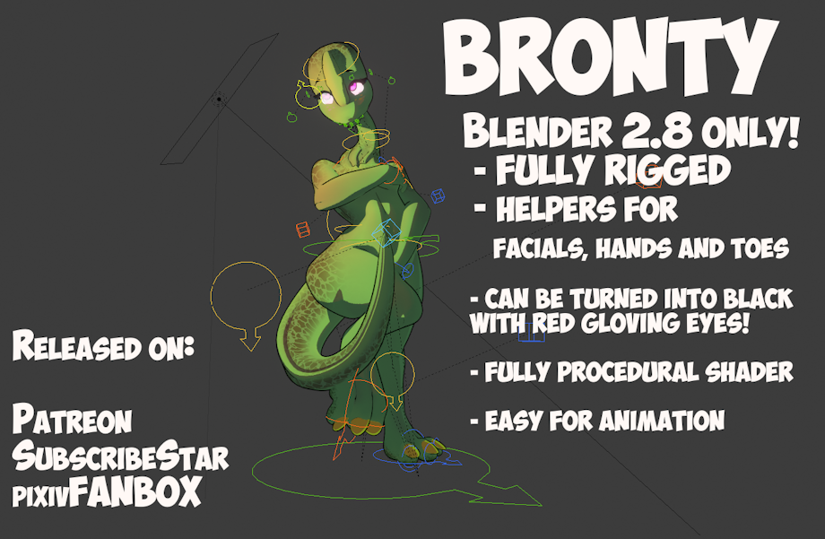 I updated model from latest animation, so, even if there no saliva strings inside, you still can do literally anything what you want do with her! Also, she look a LOT more cartoonish and drawn now, even better when on release! PS: I no idea how animate her goddamned tail, just newer had enough esperience in tail rigs XD I did a best one which i find oin tutorials, buuut... sometime it still a pain XD
