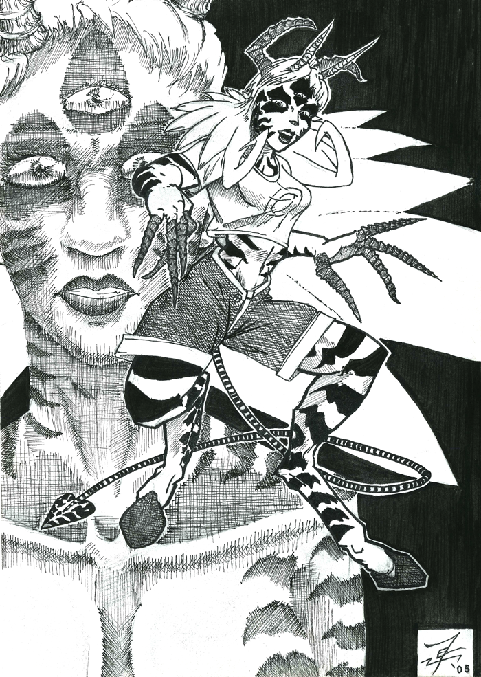 This was done some years ago (as noted by the date in the lower corner) when I was first dabbling with Inks seriously, and crosshatching for that matter. I think this drawing singlehandedly killed a .1 ZIG. I wanted to color this one eventually too. Still might, but I think it's a mighty picture, especially for my work at the time.