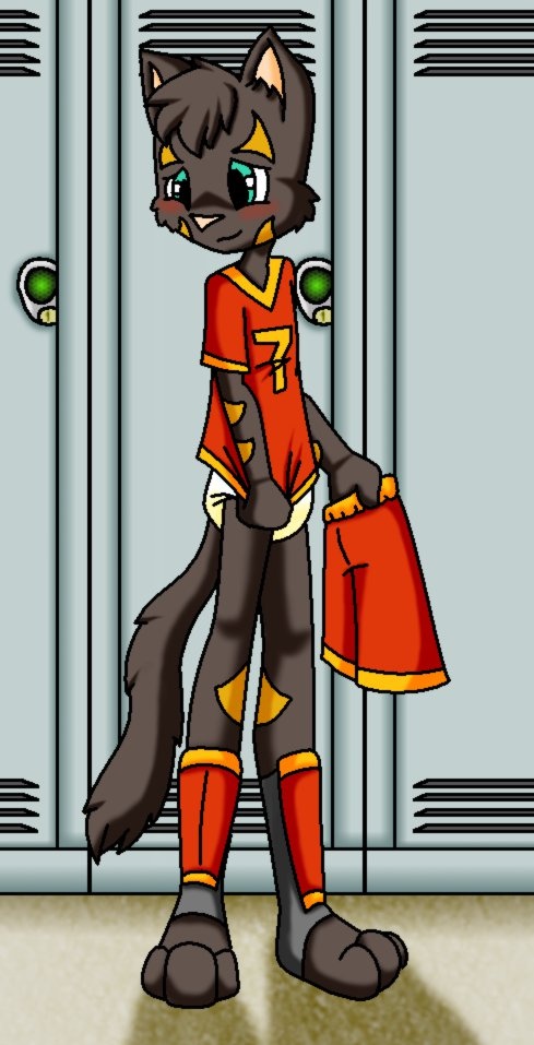 It'd been a long day out on the soccer field. Jacob had been running around and generally showing his skill at the game and trying to improve a kick or two. He was completely oblivious that his pull-on diaper was getting rather soggy as the Soccer Practice wore on. There was very little that could distract him when he had his head in the game. But once the game had settled down and everyone returned to the locker room Jacob could feel how much his pull-on was squishing between his legs and knew he definitely needed to change unless he wanted to risk springing a leak. So Jacob walked into the back of the Locker room wehre his stuff was and began to get changed. Just as he got his shorts off he was startled by someone popping their head in on him.