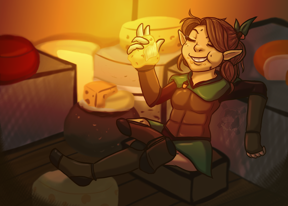 So, this little gnome rogue is a DnD character that was made as a joke. Her bio be: " She loves cheese. She knows everything about cheese. Live by the cheese, DIE by the cheese. " As a result, I present her to be in some cheese storage room or something eating some cheese.