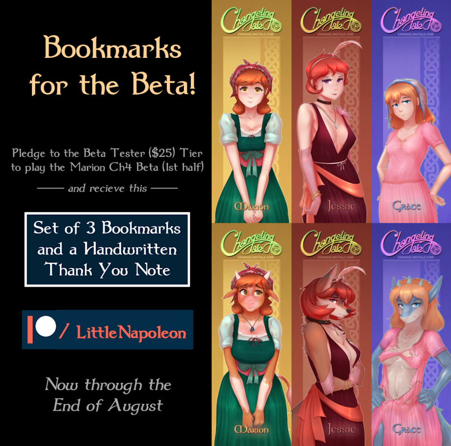 To celebrate the release of the new Beta Build (Marion's Final Chapter, 1st Half), we're making these bookmarks available to everyone in our Beta Tester ($25) Tier this month! If you want a sneak peek at Marion's final chapter and to receive the only official Changeling Tale merch currently out there, this is your chance!