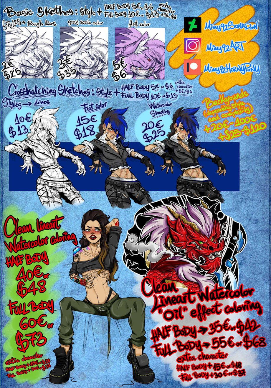 After a season dedicated almost exclusively to my illustration classes, I come back with open commissions, new styles and new prices! As you can see, there is a lot of variety and also, feeling it a lot -.-, some styles have gone up in price. This is because I wasn't charging enough for the work I dedicated to each assignment, and after consulting with my illustration teacher and colleagues, I decided to raise the prices of some of the styles, such as the typical watercolor. However, there are prices for everyone, because I also make available the sketch type with crosshatching and color that I hope you like.