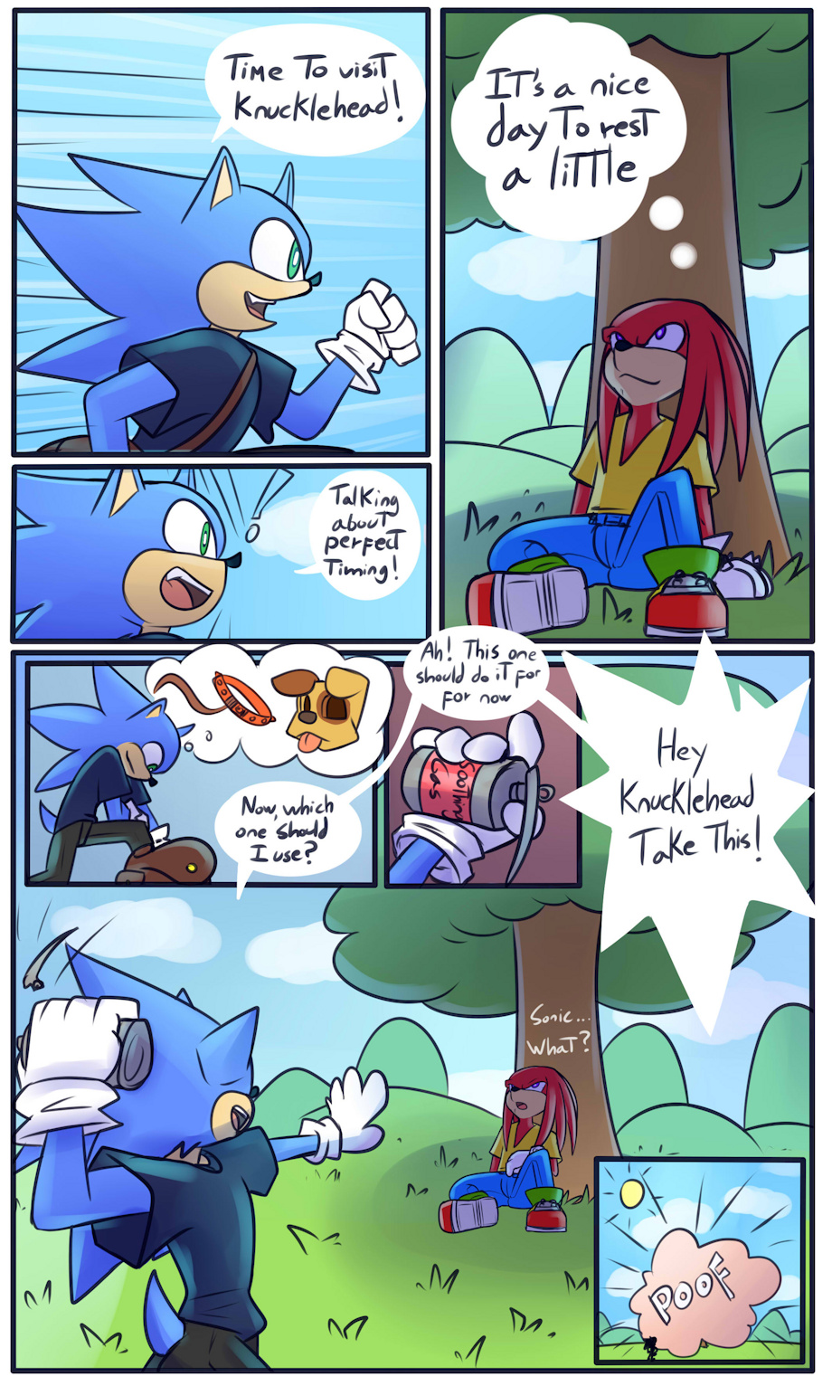 The is second page of the comic. And Sonic first target is none other than Knuckles.
