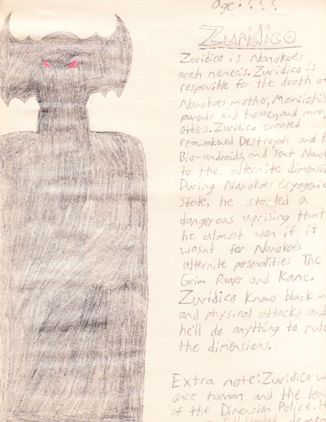 Bio: Zuridico is Nanokoe's arch nemises. He is responsible for the death of Nanokoe's mother, Momiichi's parents and home, and many others. Zuridico reawkened Korosu, and the bio androids and even sent Nanokoe into the alternite dimensions. During Nanokoe's cryogenic state, he started a dangerous uprising that he would have won if it werent for Nanokoe's father. Zuridico knows black magic and physical attacks, he'll do anything to rule the dimensions.