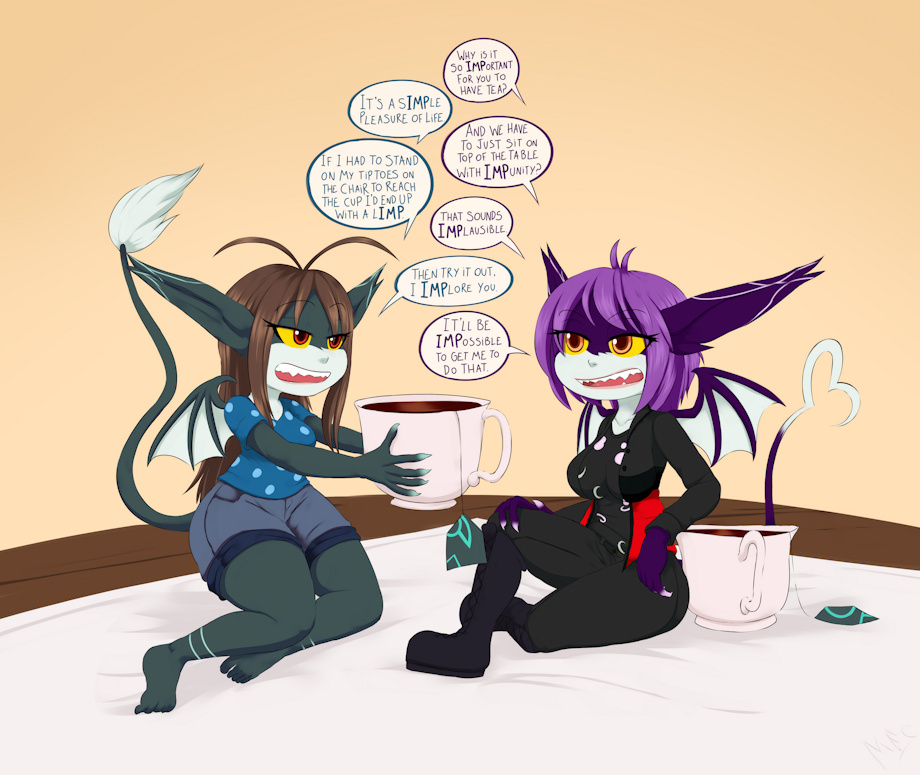 TheRoseQueenAlexis and Malkaiwot sIMPly got an impification pic starring both of them in their smol imps forms, enjoying a nice cup of tea, or it's pretty much a bowl at that size. While exchanging imp puns, it is IMPortant that you stop posthaste with this IMPure conversation!