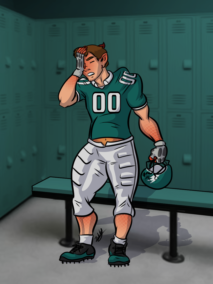 As soon as the clock ran out, Pheagle darted into the locker room. All of a sudden he had come down with a nasty headache! He pulled off his helmet - a lot harder to do than he remembered, and put a hand to his forehead. He was in so much pain that he failed to notice bright red scales growing all over his body, his belly pushing outward, growths forming near his shoulders, and horns coming out of his head - the latter which put giant cracks in his protective headgear!