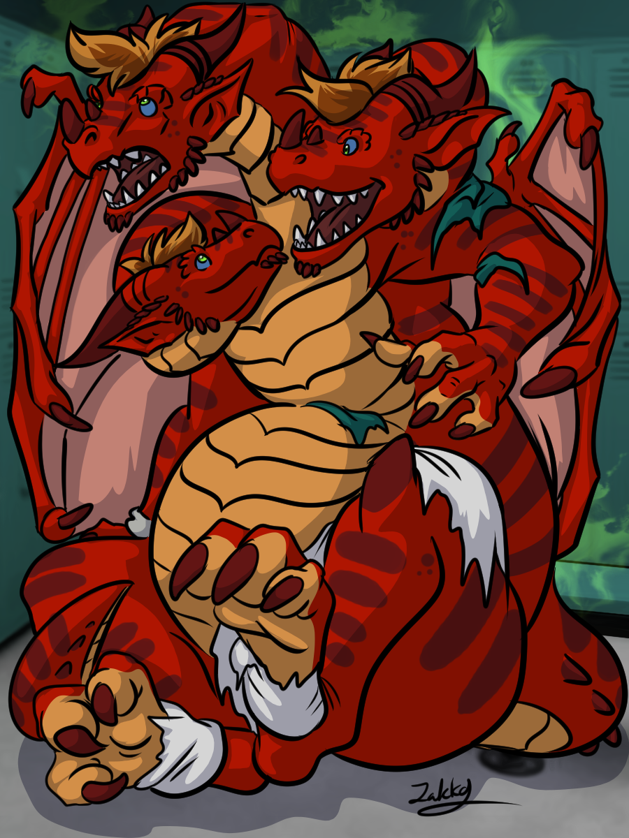 As a magical aura surrounded Pheagle, his transformation began to accelerate. Draconic talons burst through his cleats, scutes and wings shredded his football jersey, a tail pushed violently through his pants, claws destroyed his gloves, and two new heads escaped his shoulders! Pheagle screamed in agony but at this point his screams sounded more feral as his neck grew longer and his face pushed out, growing sharp fangs and becoming draconic!