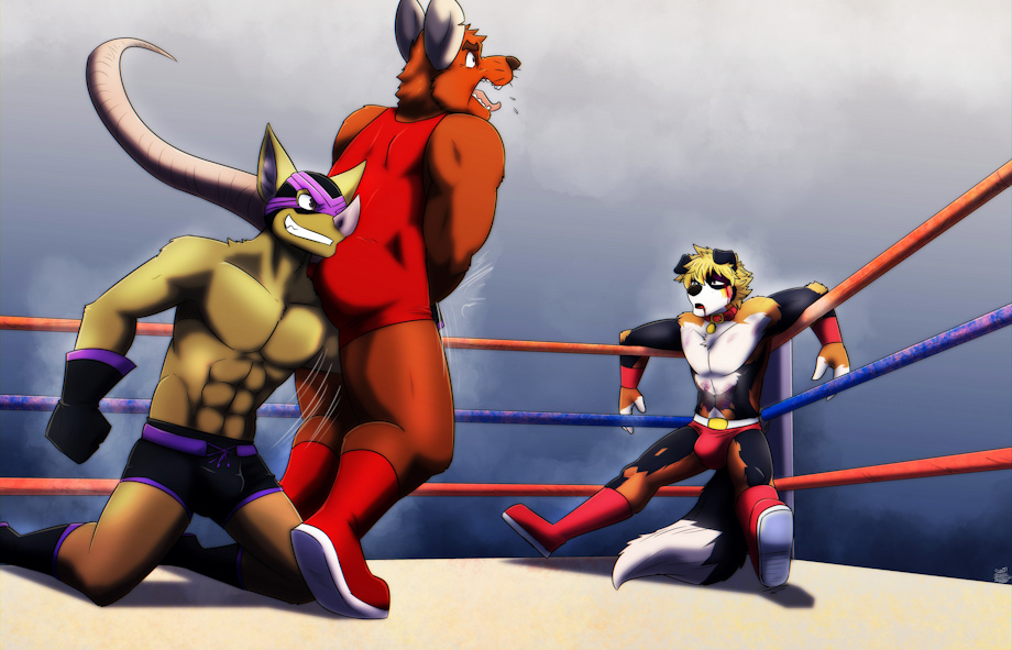 Liam had a hell of a time in this fight, the monster rat controlling much of the match and absolutely dominating. His head was swimming in dazed confusion as he stumbled into a corner, seeing some stars. He could barely make out the three rats preparing to charge him when he saw three more triplets climbing in the ring. He sunk down to the second turnbuckle, his rump barely sitting on it as his arms hung over the top ropes when he heard a rat squeak of pain and looked up, trying to focus his eyes. He realized he was seeing the rat holding the crotch of his singlet in pain, someone gave him a low blow before the referee chased Liam's mystery benefactor out of the ring.