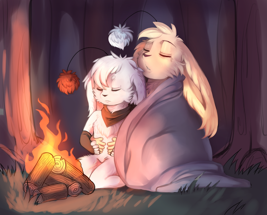 They couldn't quite make it back to the burrow from their adventure, good thing they could make a fire before falling asleep together. Mogki and Neuge just holding onto each other again.