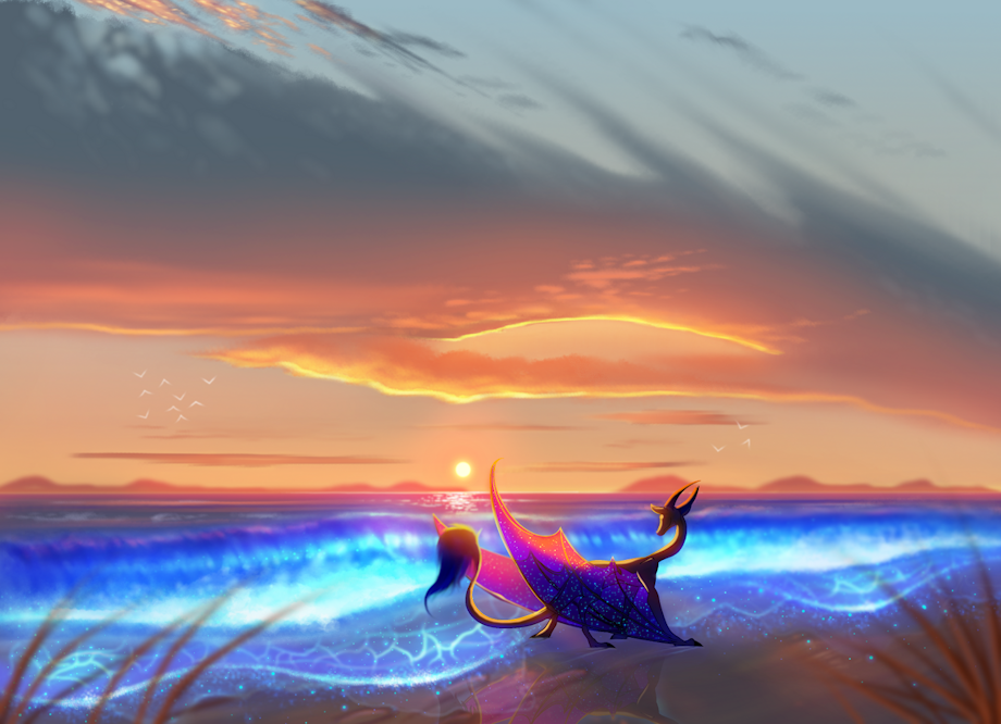 I wanted to try drawing a beach scene since I don't do them often. The glowing blue water is inspired by bioluminescent plankton - https://gyazo.com/6f91a808827790f7a0a8dafd5426d129 Which I wasn't gonna do originally but I couldn't resist, they're so beautiful! ;w;