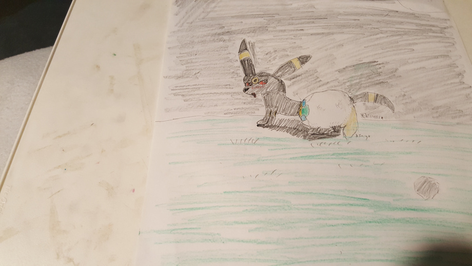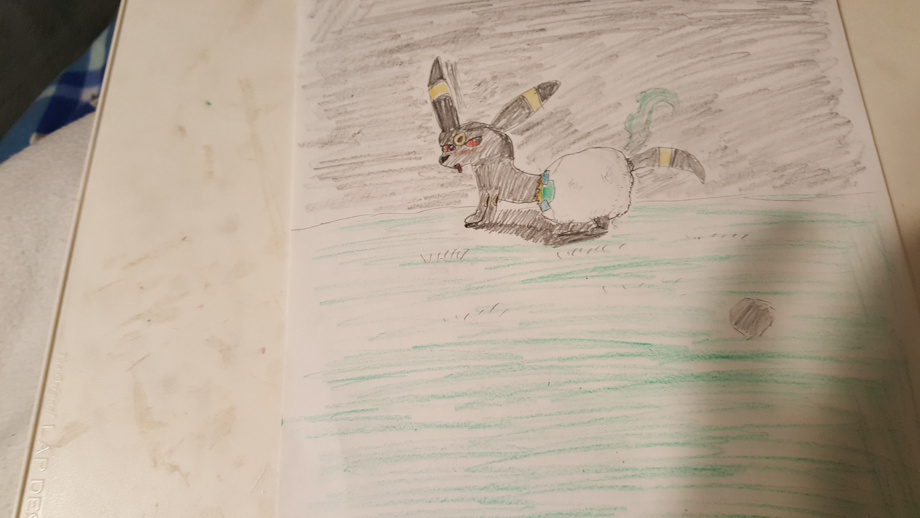 A series of sketches of a grown Umbreon confused about the diaper wrapped snugly around its rump, and how it slowly starts to grow used to its comfy new pampers.