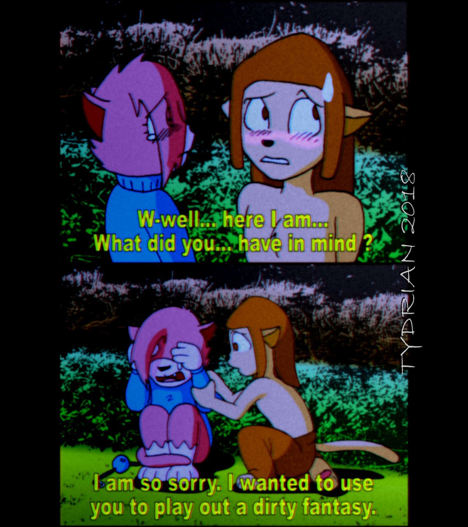 As it turns out, a secret love affair is going on between Ms. Redpine and her employer, Slatz Cat. Their secret encounters have been leading up to this: When Ms. Redpine gets on her knees in front of him for the first time, as Slatz Cat opens his jacket in front of her brightly-blushing face.
