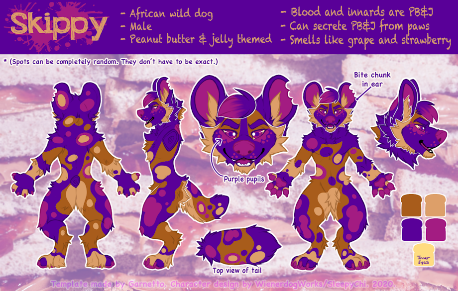 Meet my new character: Skippy the peanut butter and jelly themed African wild dog!