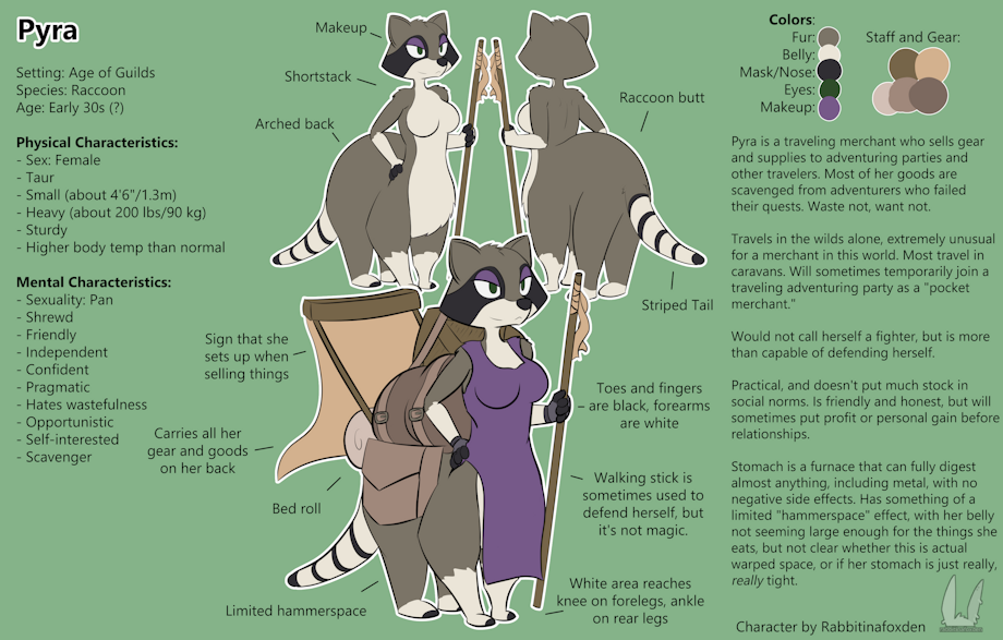 Here it is, the official ref sheet! Meet Pyra! She's everyone's favorite cute little traveling merchant raccoon. But be careful if you decide to cross her -- it may be the last thing you ever do.