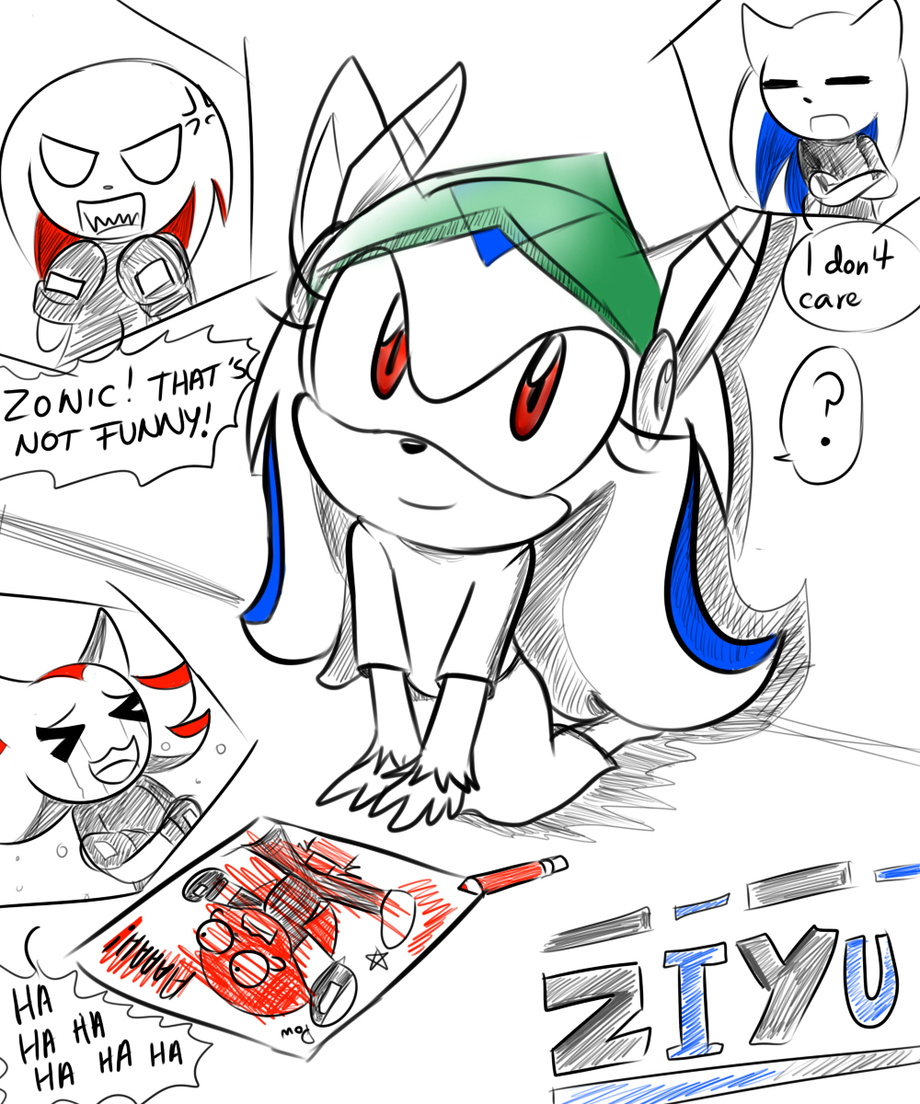 Zuckles (Knuckles) is angry because the little Ziyu (Zonic and Zhadow's baby) colored a pic when he suffer a painful accident when he was training, Zonic doesn't matter much that and Zhadow is laughing at the drawing