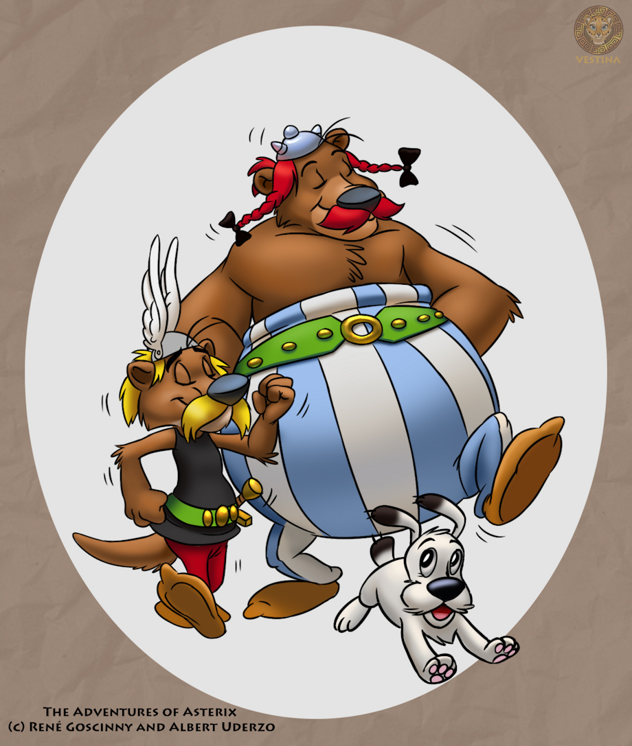 Yeah, the dog was the most difficult part to decide how to draw it :) Honestly the Asterix is not a wolf. He is a mink. Guys supposed to be a bear and a mink :) But the stilisation did not let me depict the Mink Asterix properly :)