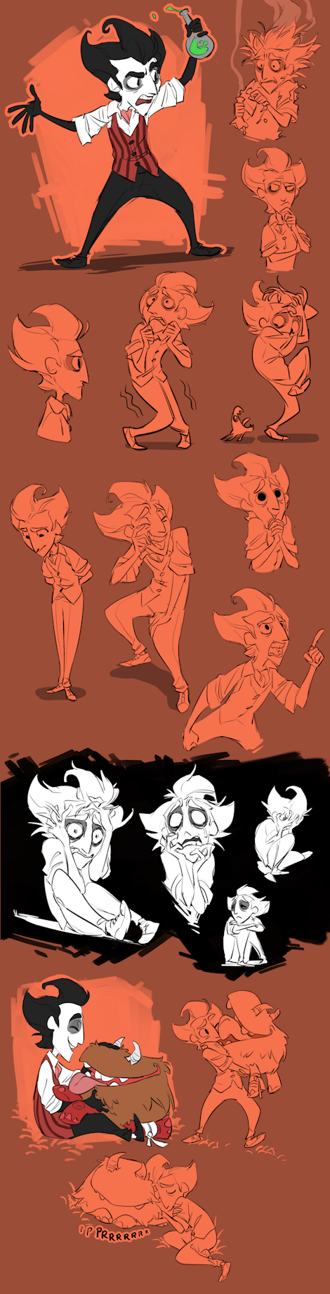 When I drew these I just started playing with the game. But I immediately fell in love with the art style (like Tim Burton's) and the characters. So my first thing was to try drawing things with Wilson in my own style. (I was thinking irrationally long about giving him blank white eyes or not, but I decided to go with my own style in this matter too.) I think I'd like to draw more things in the future with the game's style too for practice. It seriously looks like a fun, expressive style :)