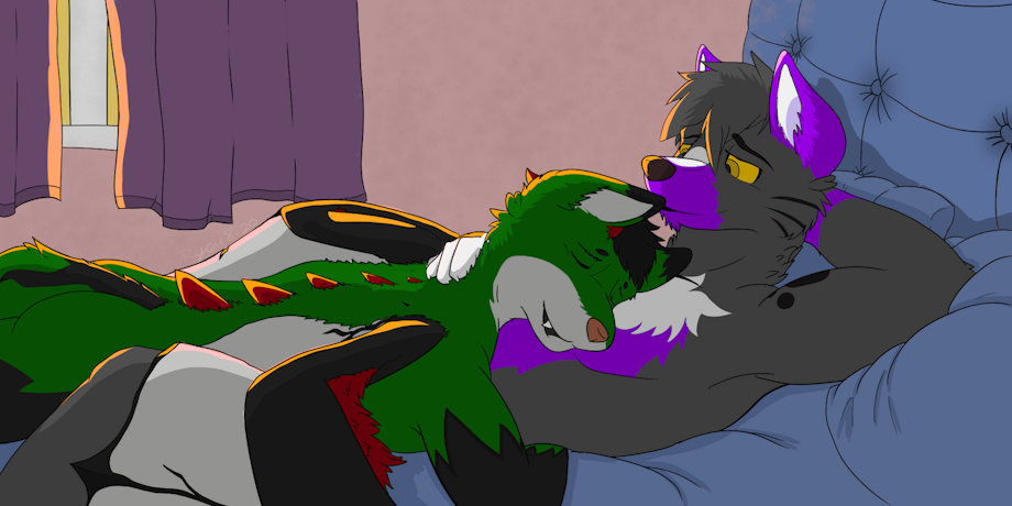 A very precious commission for Lilac Wolf of himself and his boyfriend, with Lilac enjoying the view of his boyf passed out.