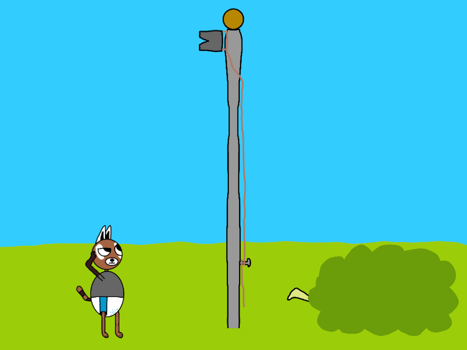 Khan, after another failed attempt to woo Ling Ling, went back to where he had left his shorts only to find them on the top of the flagpole. Khan questioned how they gotten up there, unaware of a certain Riolu's tail sticking out of the bush next to the flagpole who may or may not have had something to do with this.