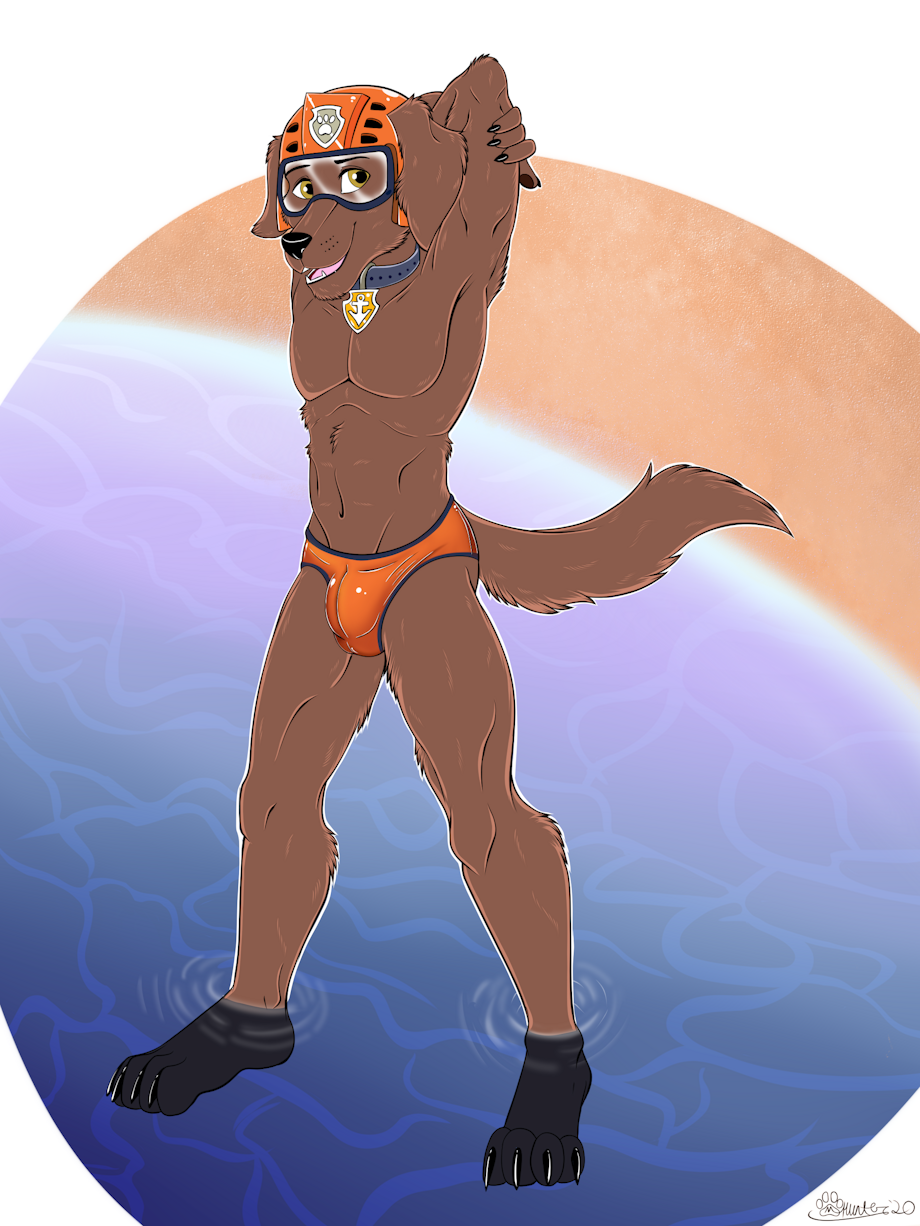 Drew this when I was on a Paw Patrol kick. Fanart of Zuma because I saw this in my mind one day while watching. Originally, the picture in my mind had him wearing swimming trunks, but then I realized that I didn't understand how to draw the bagginess of them so I felt that a speedo would be easier. :x