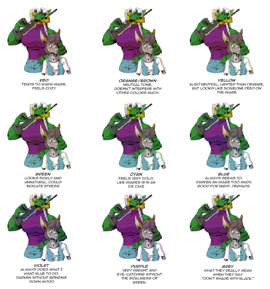 Made a chart regarding shading colors, with some commentary on how I feel they effect a scene based on my personal experiences. Hope some of you find this helpful.