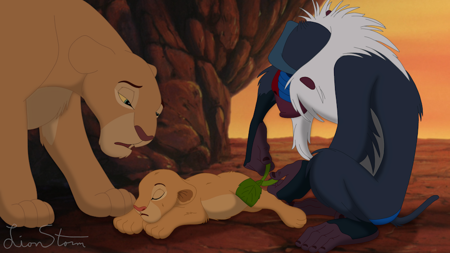 The two sat in silence for what felt like hours as Simba silently wept for his friend. Before long, the sun began to set on the horizon, its fleeting orange glow casting long shadows across the den like foreboding fingers reaching out to take Nala away. As if on cue, a low murmur began to drift across the den. It was then that Simba’s young heart shattered. Sarafina was sitting next to Nala, her head hung low with tears freely flowing. Several of the other lionesses had begun to sadly gather around as well, and even Rafiki now held his head in sorrow.