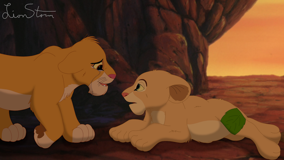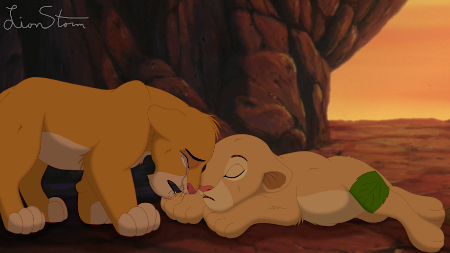 Simba’s bloodshot eyes snapped open as the soft sound reached his ears. The word was so quiet it was almost inaudible, but he was sure that he had heard it. Heart pounding in his chest, the prince slowly looked down at his friend. The cub wondered for a moment if he might be delusional, because there, timidly staring back at him, was a pair of teal-blue eyes. “N-Nala?” Simba struggled to contain the flood of emotions that threatened to overwhelm him as he gazed into the most beautiful eyes he had ever seen. She was alive! A huge grin slowly spread across the prince’s face even as he continued to sob uncontrollably. Momentarily unable to speak, Simba gently pressed his forehead against Nala’s in an emotional nuzzle. He had never been so happy to hear her voice in his young life.