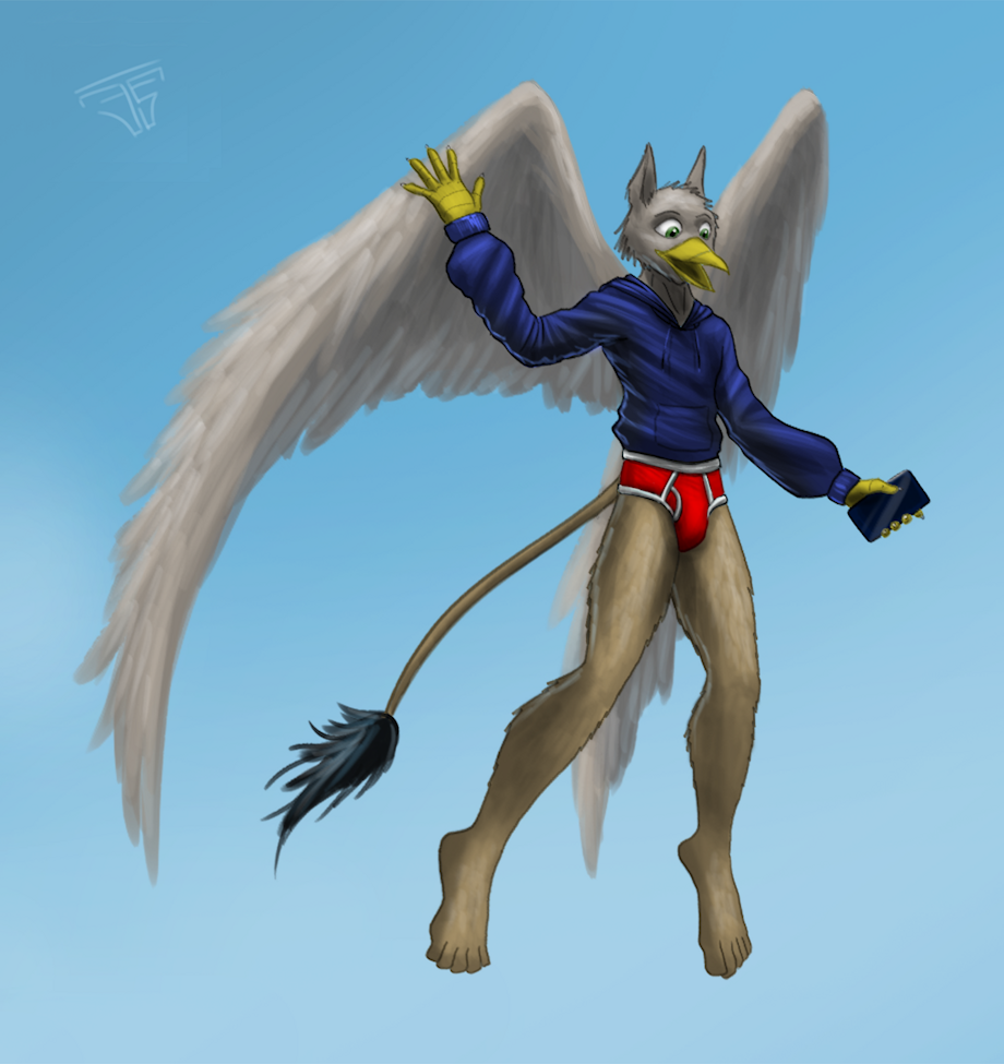 Commission for IzzyBlacktail of his OC flying sans his trousers and rocking a lovely hoodie.