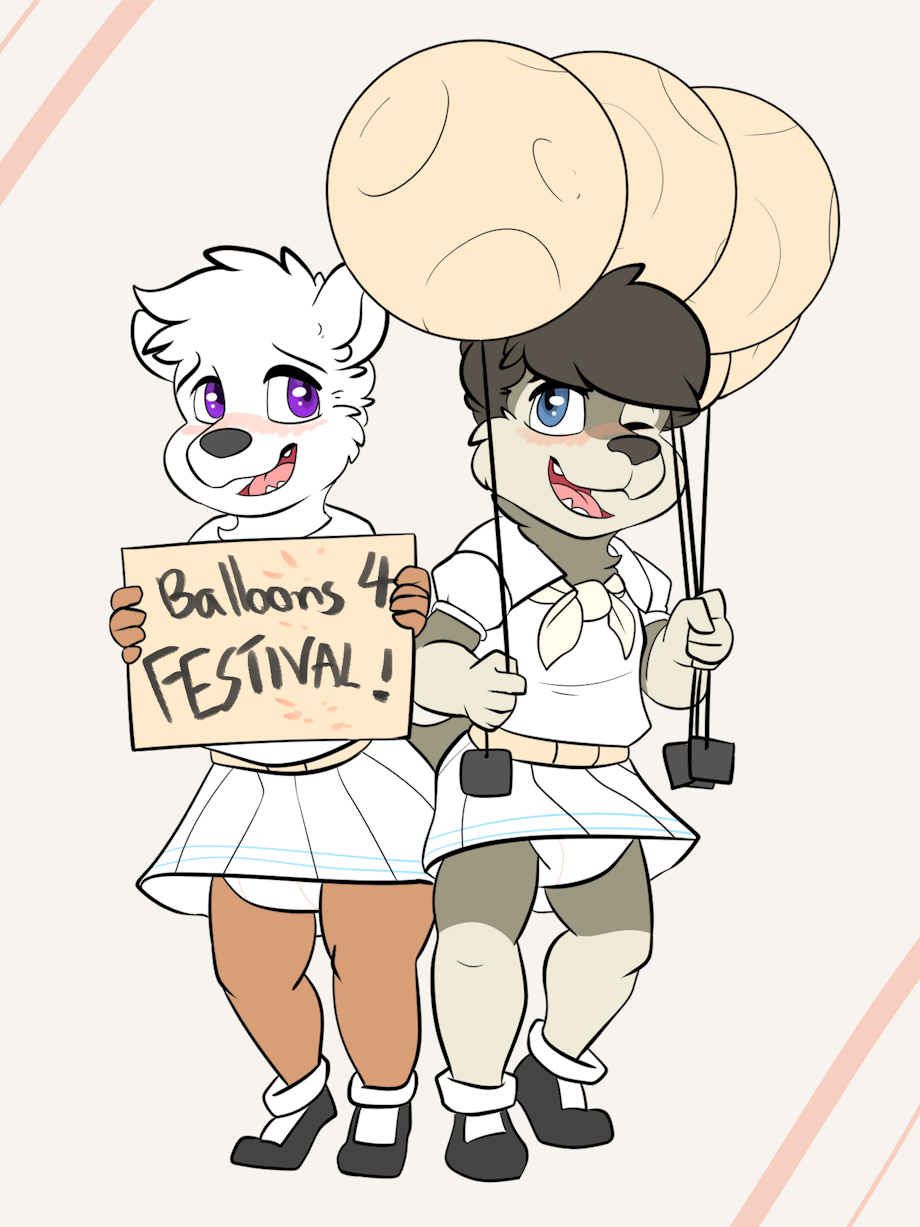 Once they were dressed Fiona inspected the boys. The uniforms fit them well and as she had intended the skirts were just short enough that their padding peeked out a bit. “Oh my, I promised the club no cub would be afraid of you two and I’m certain of that now. Snow you carry the balloons and Loupy the sign”.