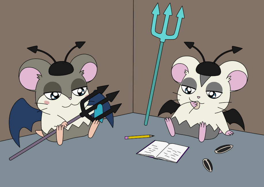 So I've been slightly obsessed with Spat lately~ X3 Got lots of pictures and the 3 Japanese episodes he features in (they really use him SUPER sparingly, don't they ;w; ). So I decided to try drawing him too, as both the anime version and the game version. And then they're together! O-O;; Two Spats are definitely scarier than one~ ^^; Or maybe just more dangerous, since let's be real, hamsters are cute even when they're evil little douchebags~ XD That could probably level city buildings... >>;