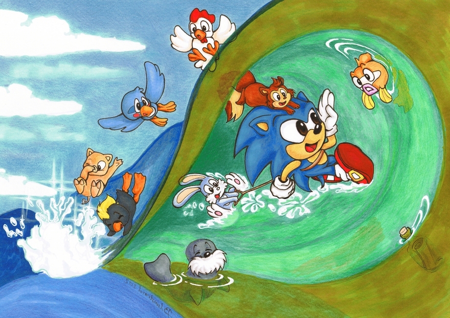 ...And here, he’s with friends; if he lost speed, they’d hold him up. I picked the South Island crew because another thing that inspires me about Sonic is his loyalty to his friends. These guys were the first bunch of them, and we don’t really see them anymore. But the aforementioned outlines also say he keeps coming back to South Island, making it the closest thing he has to a home - so it seems he goes back to see his first friends, no matter how many he gains around the world.
