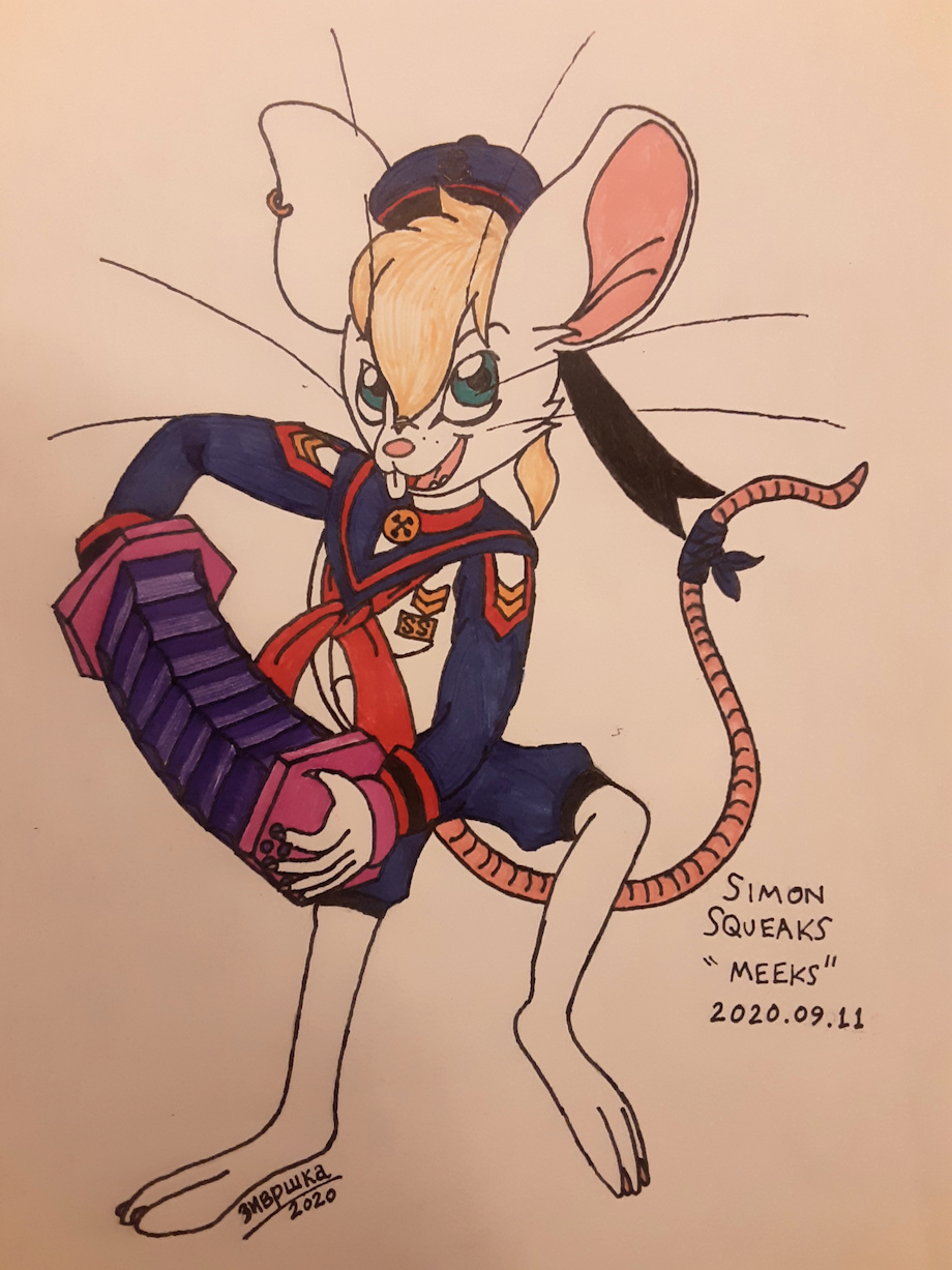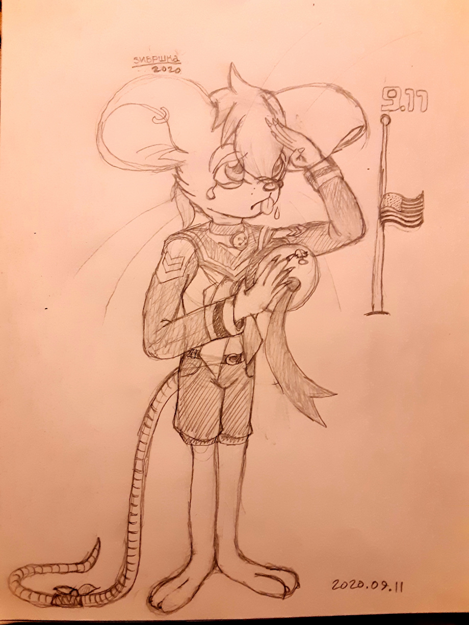 Patriot day is a relatively new commoration. It is in honor of those that died in the events of 9-11, the terrorist attack on the twin towers and other targets on September 11th, 2001. This is an anachronistic image because Meeks lives in the 1940s so this is well after his "time". I don't know if he lost anyone, but even if he didn't he would cry regardless. He is extremely patriotic and sentimental as well. He would simply cry for the lives lost and the fact that furmerica, his own country to which he is extremely loyal, was attacked. I chose Meeks because his character fits a patriotic day. Maybe I'll draw Meeks again for 4th of July. Then he can have something to be Jovial about.