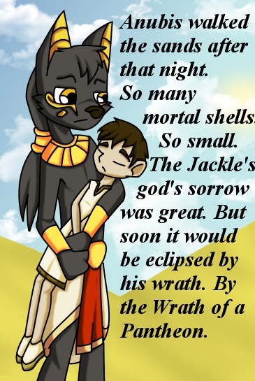 Anubis walked the many paths of Egypt. He'd been busy lately. Very busy. He largely ignored the comings and goings of a man purporting to worship a single god. He assumed it was just some Ra cultist. The man was asking for his people to be freed. Anubis only paid enough attention to hope the current Pharaoh would agree. No slaves would mean paying jobs and that would be better for the people as a whole. Besides the idea of mortals owning other mortals didn't sit well with him. But he ignored it. The various plagues. His attention remained more at his post. And all the others assumed someone else was looking into it. Then it happened. Anubis felt it. Everyone in the Pantheon felt it. Mass Death of mortals. Anubis was busy. So many mortals dead. So many of them children. Anubis took great care in escorting them to their afterlives. He was too absorbed by his work to acknowledge the exodus of so many from the land or the political fallout. But as he went too and from the plains of existence he heard the name of the Deity responsible. Yahweh. He'd remember it. For eventually the work would be finished and sorrow would give way to wrath and this lone deity would learn what the members of an Angered Pantheon could accomplish.